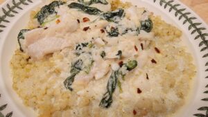It is a very simple dish, ready within 10 minutes. And with side of rice, couscous or pasta makes very satisfying meal.  Works with salmon, but probably not too fatty white fish is best for this recipe.