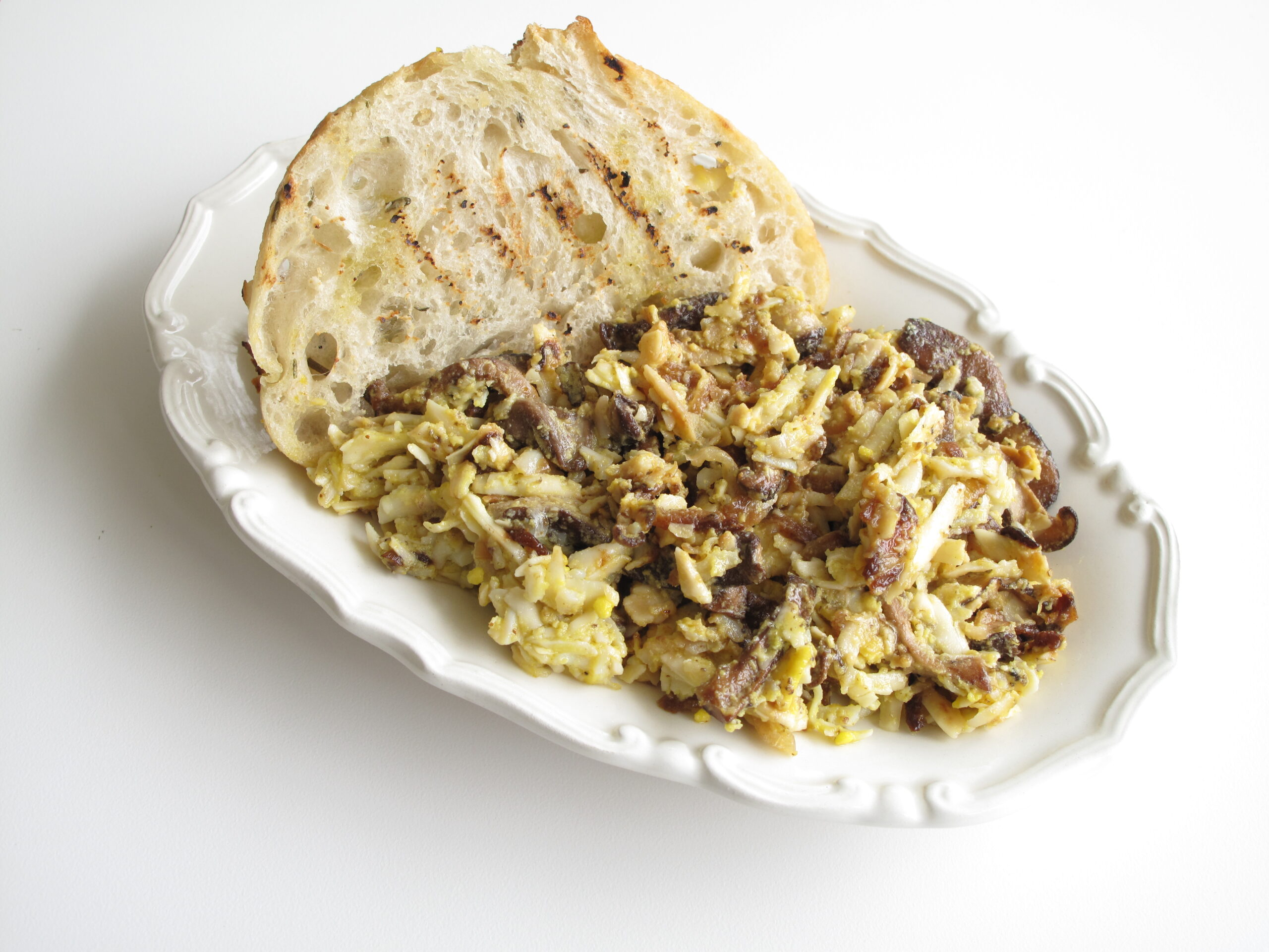 - Using hand grinder grind hard boiled eggs and the cheese, add to fried mushrooms and onions.