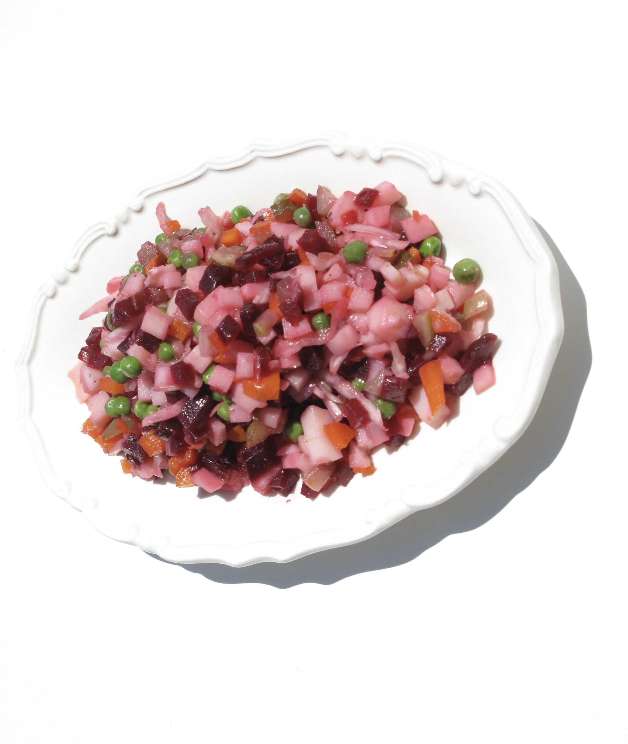 The ingredients are all simple and very available with the exception of Russian style sauerkraut (you find in any Russian store), but it can be replaced with the regular or totally skip, just put more pickles. The unique taste is again a combination of sweet (beets, potato, carrots, peas) and salty or marinated pickles. The proportions are super flexible too – put more beets if you like it sweeter, add pickles if you want more crunch and brine.